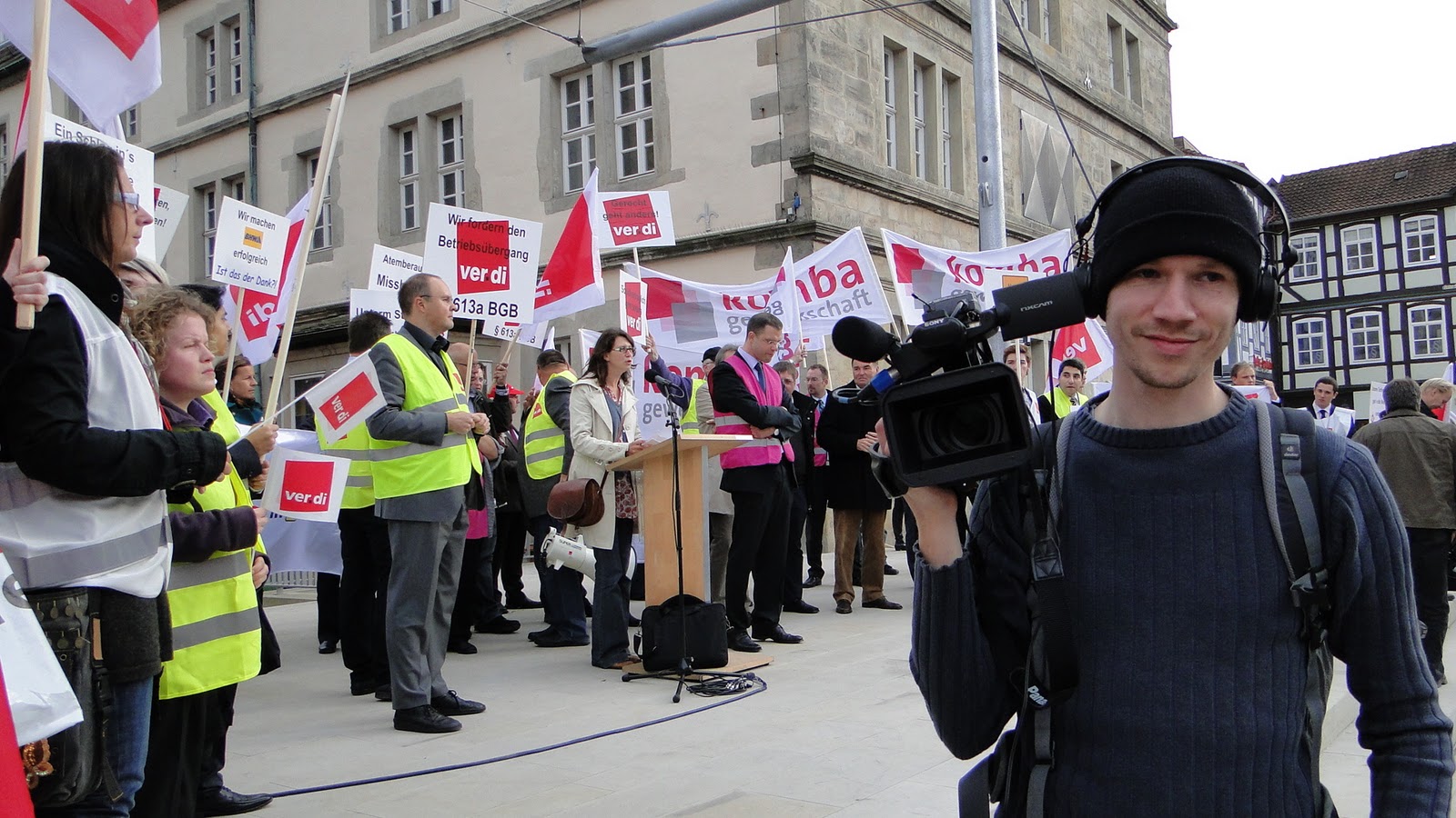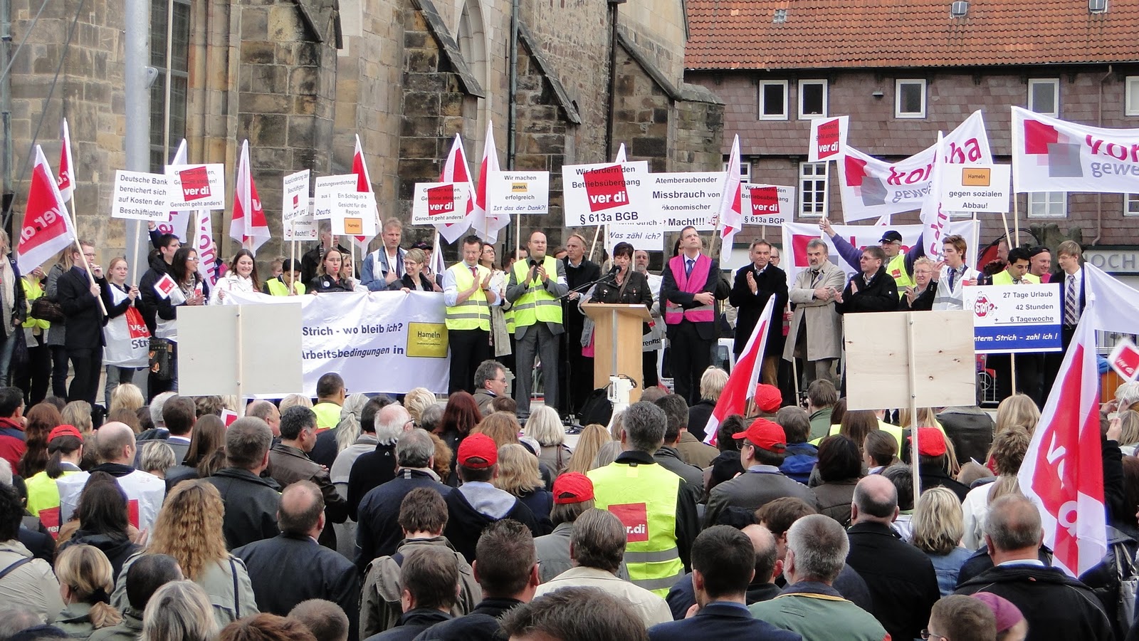 Die Fotos vom Warnstreik auf dem Pferdemarkt vor dem Hochzeitshaus in Hameln zeigen, dass die Hamelner BHW Mitarbeiter gewillt sind, der Deutschen Bank die Flötentöne beizubringen, und die Sparpläne der Deutschen Bank auf dem Rücken der Beschäftigten nicht hinzunehmen.